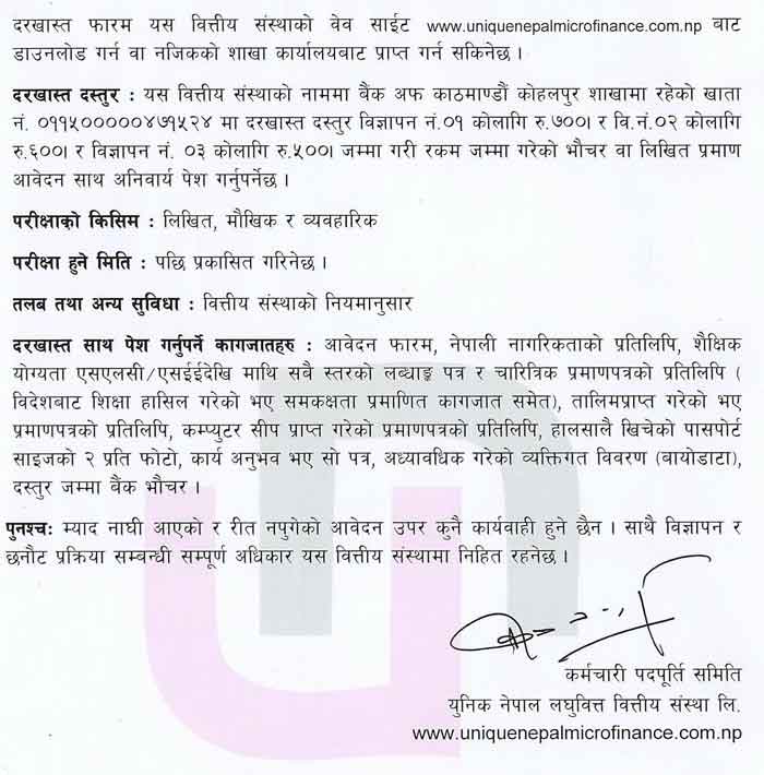 The application can be submitted at the central office or the nearest branch office of this financial institution or at the email address uniquenepal.vacancy@gmail.com till 17th Kartik 2079 at 5 pm.