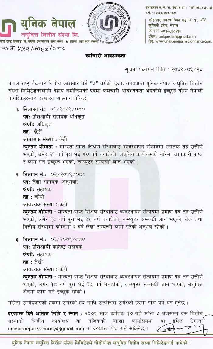 Unique Nepal Laghubitta Bittiya Microfinance Job Vacancy Apply Banking Jobs