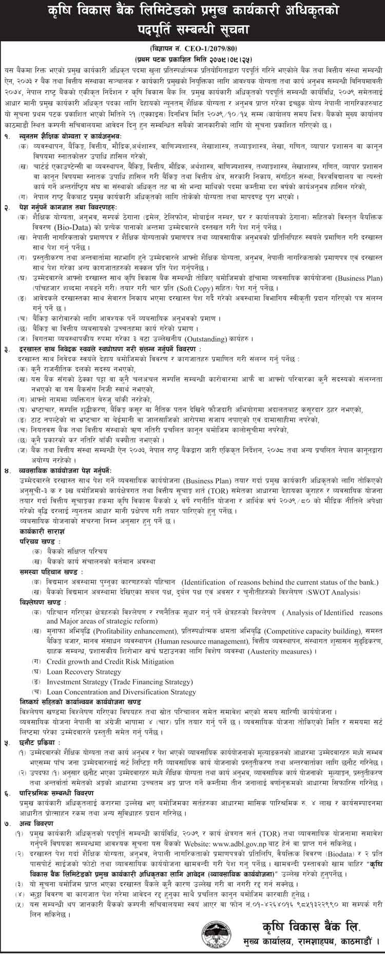 Required Qualifications and Work Experience for the Appointment of Directors and Chief Executive Officers of Banks and Financial Institutions, 2074, Nepal Rastra Bank’s Integrated Guidelines and Agricultural Development Bank Ltd. Based on the procedure for filling the position of Chief Executive Officer.