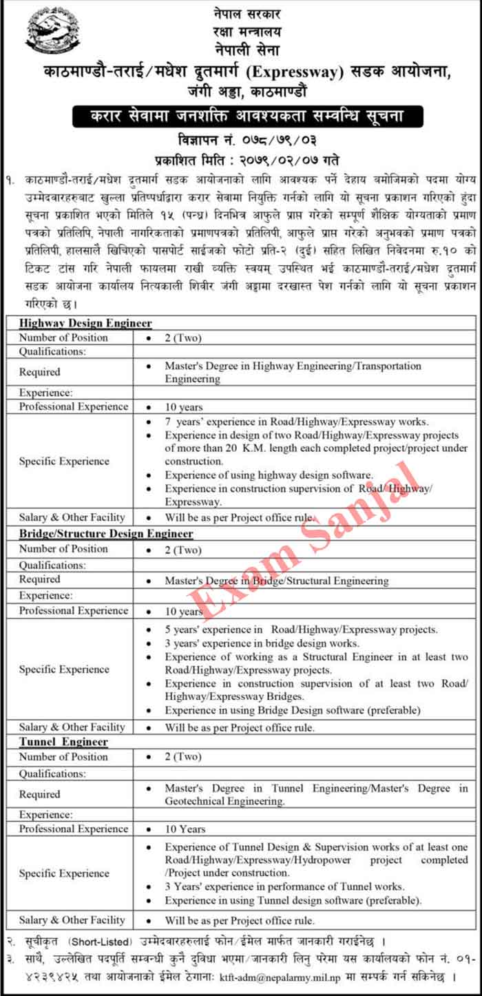 Kathmandu Terai Madhesh Drutmarg Fasttrack (Kathmandu Terai Expressway) project published a job vacancy notice. This information is published for the appointment of eligible candidates for the following posts required for the Kathmandu-Terai Madhesh Expressway Road Project. various numbers of Vacancy post for in given jobs post published by Kathmandu Terai Expressway.