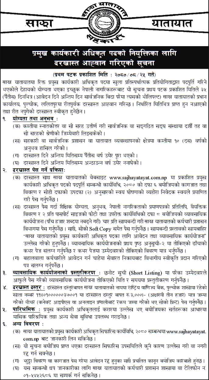 Saajha Yatayat Published the job vacancy for the post of Chief Executive Officer in Common Transport will be filled through an open competition, interested Nepali citizens with the following qualifications should duly apply to the Head Office of Common Transport, Pulchok, Lalitpur within 35 (thirty-five) days from the date of first publication of this notice (the last day of application if it falls on a public holiday).