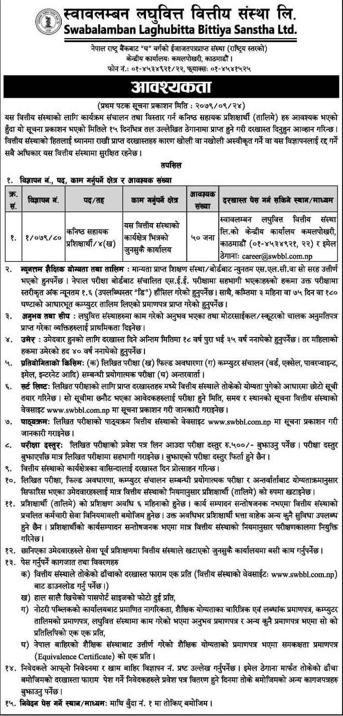 Swabalamban Laghubitta Bittiye Sanstha Microfinance published the job vacancy notice for various posts. All the job vacancy notice details of Swalamban Laghubitta Bittiya Sanstha are given below.