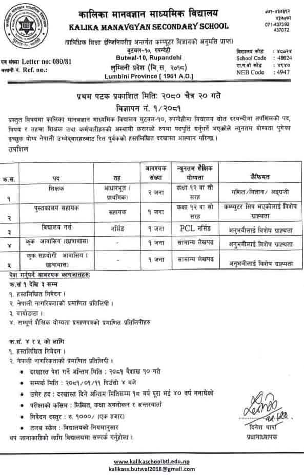 In the presented subject, Kalika Manavgyan Secondary School Butwal-10, Rupandehi has to be filled as a temporary contract position of teachers and staff in the school resource Darwandi.