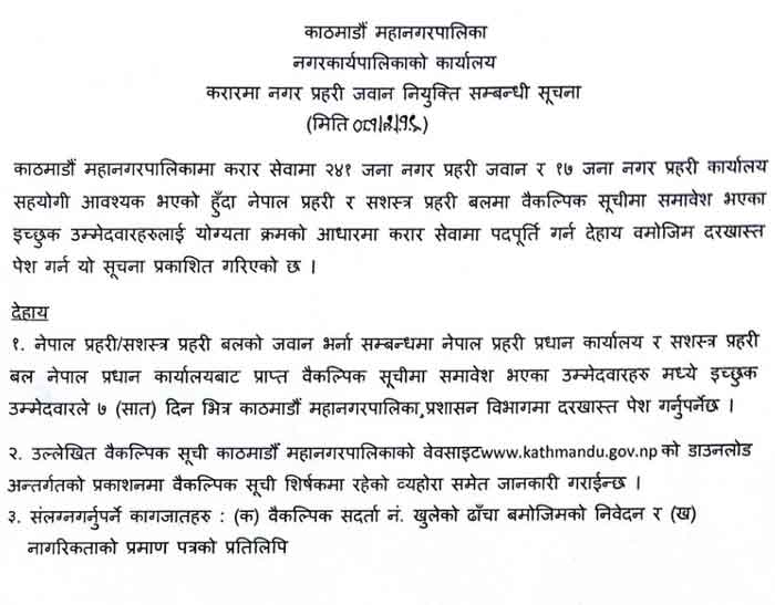 The Kathmandu Metropolitan City will be filling up 241 city police constables & 17 Nagar Police Officer Helper in contract service based on the order of merit as follows, applications are invited to Kathmandu Metropolitan City, Administration Department within 7 (seven) days from the date of publication of this notice.