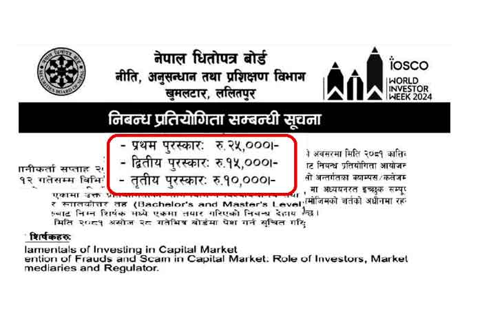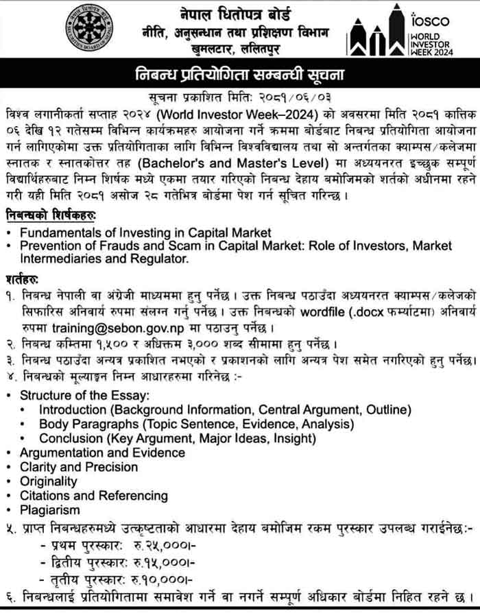 Nepal Securities Board Policy, Research and Training Department Khumaltar, Lalitpur published essay competition application notice on the occassion of WORLD INVESTOR WEEK 2024. Free Open Essay Competition by Nepal Dhitopatra Board. Ap Essay Competition open for all- World Investor Week-2024 (World Investor Week-2024).