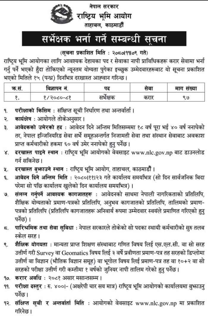 Educational Qualification: S.L.C in mathematics from a recognized educational institution. Or equivalent and pass 3 years Proficiency Certificate level diploma in Survey or Geomatics or Certificate level in Science (Physical Science Group) or Geography or 10+2 or equivalent examination and minimum 1 year Junior Surveyor Must have been trained.