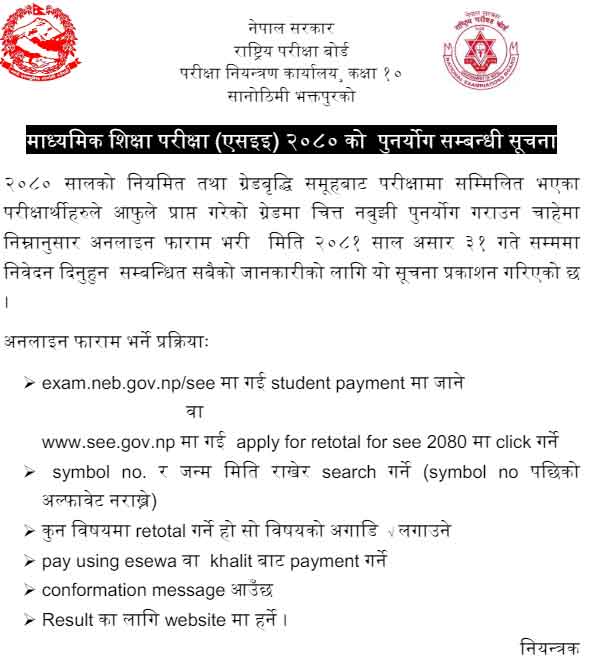 SEE result recheck Retotaling notice published by Rastriya Pariksha Board. SEE Retotal Punaryog online application open for All. Exam.neb.gov.np retotal application. NEB notice regarding SEE Result Re Total. SEE natija punaryog notice. SEE Result Retotal recheck process details. National Examination Board Examination Control Office, Class 10 Notice regarding re-total of SEE examination of Sanothimi Bhaktapur 2080 2081.