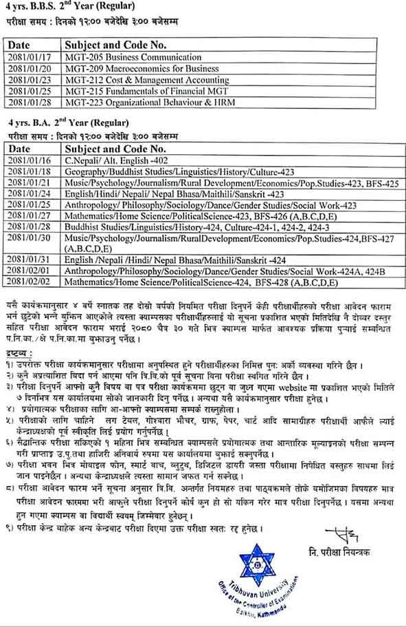 Tribhuwan University TU recently published the examination routine schedule of 4/3 years BBS, BSC, BEd, and BA 2nd Year. Bachelor’s second-year exam routine of BBS, BSC, Bed & BA faculty are given below. TU Recently revised the routine of BBS BSC BED & BA exam.