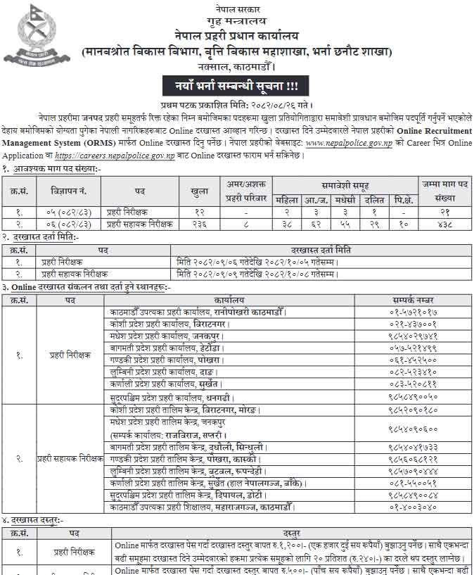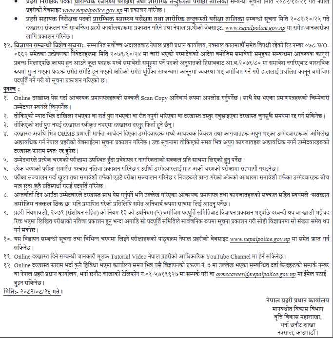 On 26 Mangsir 2082 (Friday), the Nepal Police Headquarters released an official notice inviting applications for: