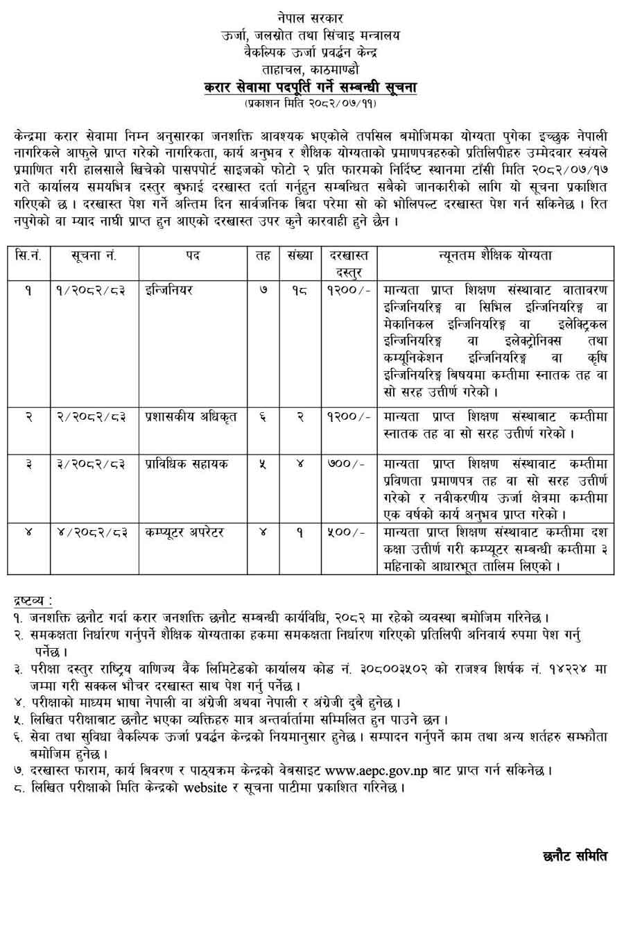 The Alternative Energy Promotion Centre (AEPC) under the Ministry of Energy, Water Resources, and Irrigation, Government of Nepal, has announced vacancies for various posts on a contract basis. Qualified and interested Nepali citizens are invited to apply by submitting the required documents and application form by 2082/07/15.