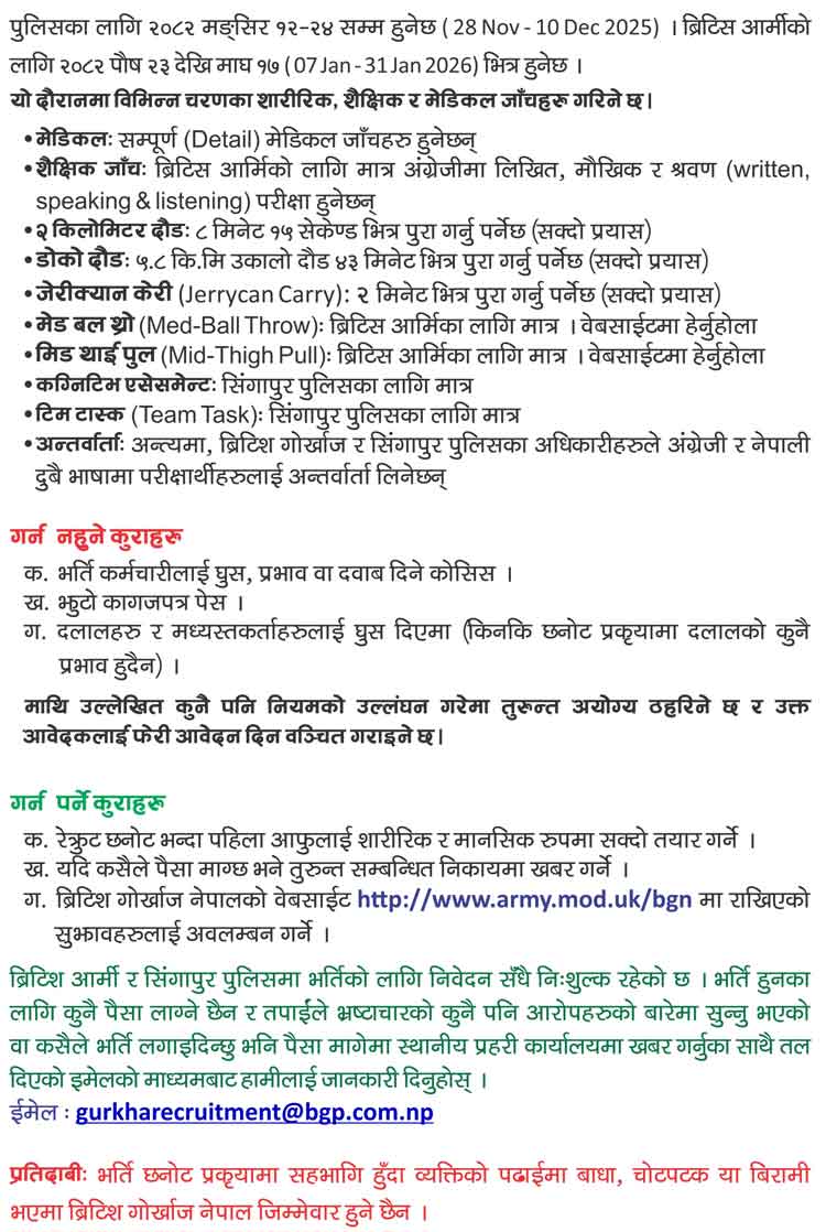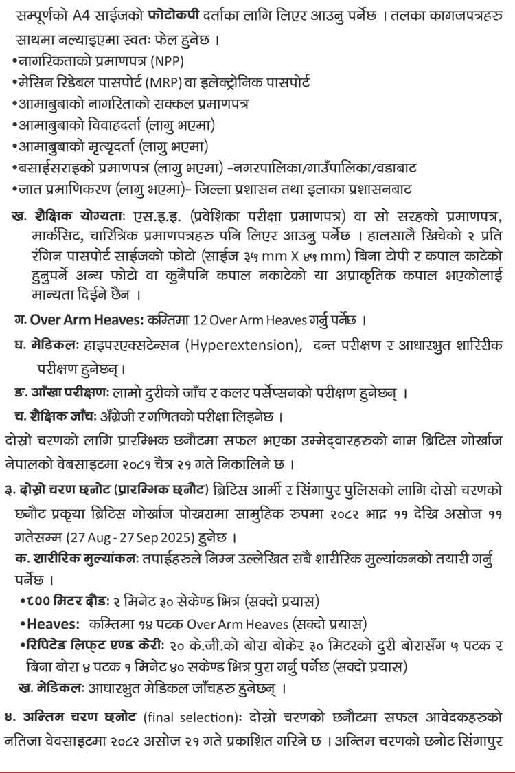 The combined British Army & GCSPF Phase 2 Selection will be held in British Gurkhas Pokhara, The dates for the combined selection will be between 27 Aug-27 Sep 2025. Only successful Candidates will be called forward for the Final Selection. The call forward instructions for the final selection will be published on 07 Oct 2025 for both British Army & GCSPF candidates.