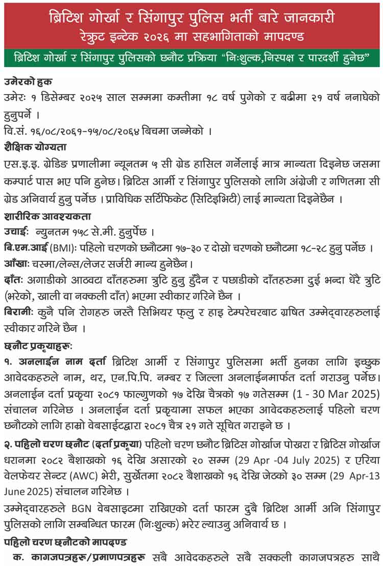 The 2026 intake for the Gurkha Contingent of the Singapore Police Force presents a prestigious career opportunity for eligible Nepalese candidates. With its competitive benefits package, career stability, and honored tradition, positions in this elite unit remain highly sought after. Interested candidates should begin preparations immediately and ensure they meet all eligibility criteria before submitting their applications.
