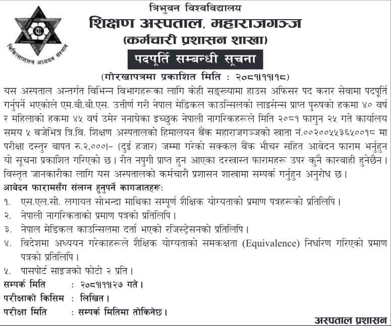 TU Teaching Hospital published a notice regarding the vacancy for MBBS Passed & NMC License candidates in various numbers. House Officer Job vacancy notice by TU Teaching Hospital. Tribhuvan University Teaching Hospital, Maharajgunj (Employee Administration Branch). Under this hospital, the post of house officer (number 10) for various departments is to be filled in contract service, so MBBS passed Nepali citizens and obtained the license of Nepal Medical Council are requested to fill up job vacancy.