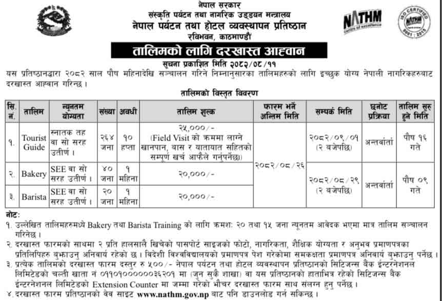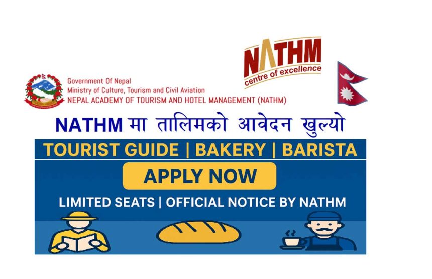 The Nepal Academy of Tourism and Hotel Management (NATHM) under the Ministry of Culture, Tourism & Civil Aviation has officially opened applications for various professional training programs for the month of Poush, 2082. Eligible Nepali citizens can now apply for Tourist Guide Training, Bakery Training, and Barista training courses.