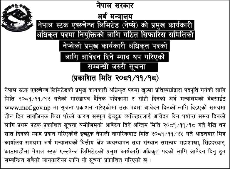The Ministry of Finance, Government of Nepal, has issued an important notice regarding the extension of the application deadline for the position of Chief Executive Officer (CEO) at Nepal Stock Exchange Limited (NEPSE). NEPSE CEO Job vacancy application deadline extended.