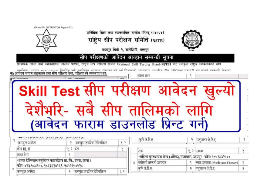 Skill Test Application Form Open. National Skill Testing Board form open to check verify your skill. According to the National Vocational Skill Certificate approved by Technical Education and Vocational Training Council, National Skill Testing Board-NSTB, NSTB/NVQS will be conducted at a concessional fee to the regular side who want to participate in the skill test based on the recognition of prior learning, employment in the country and returnees from foreign employment. This information has been published for the information of all those concerned to attend the skill test center and submit the application form according to the details available from experienced Nepali citizens.