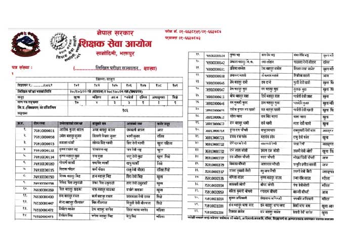 Primary Prabi Taha Teacher vacancy exam result published by TSC. Teacher Service Commission TSC Prabi Prathamik Taha Result. Teacher Service Commission TSC published the Primary Level Pra Bi result of various districts and provinces. Pra Bi Result TSC published by Teacher Service Commission. All the primary result details name lists and interview timetable are given below.
