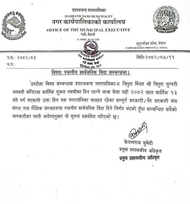 On this occasion, all government offices, non-governmental organizations, and educational institutions under the jurisdiction of Dasharathchand Municipality will remain closed.