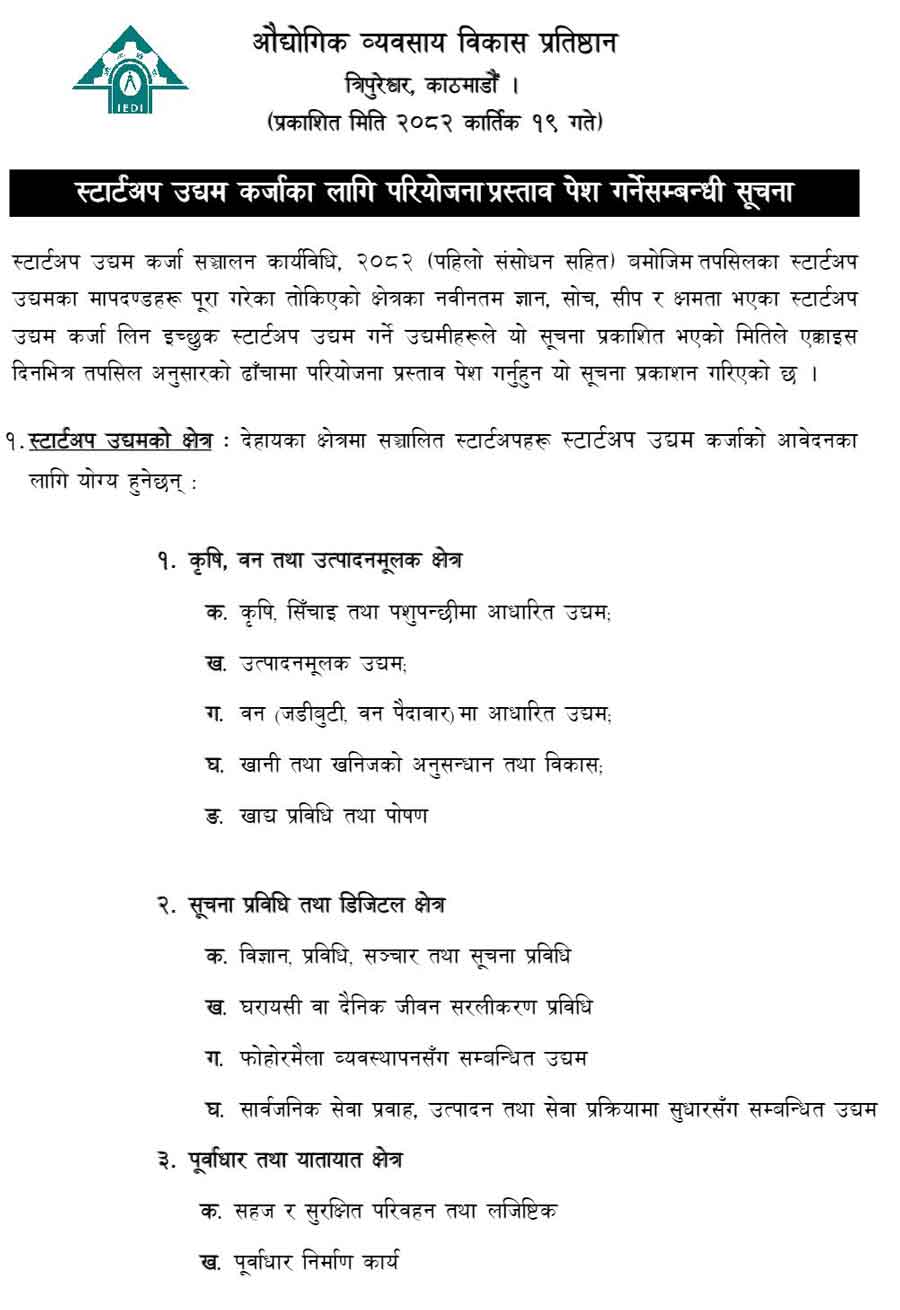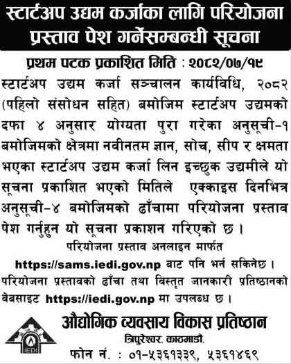Startup Loan in Nepal 2082. Apply Startup Enterprise Uddham Loan in Nepal. The Government of Nepal, through the Industrial Enterprise Development Institute (IEDI), has officially called for project proposals for Startup Enterprise Loans 2082 under the Startup Udhyam Karja Sanchalan Karyabidhi 2082.