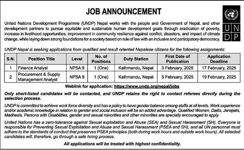 UNDP is committed to achieve work force diversity and has a policy to have gender balance among staffs at all levels. Work experience and/or academic knowledge in relation to gender and social inclusion will be an added advantage. Qualified Women, Dalits, Janajatis, Madhesis, Persons with Disabilities, gender and sexual minorities and other minorities are specially encouraged to apply.