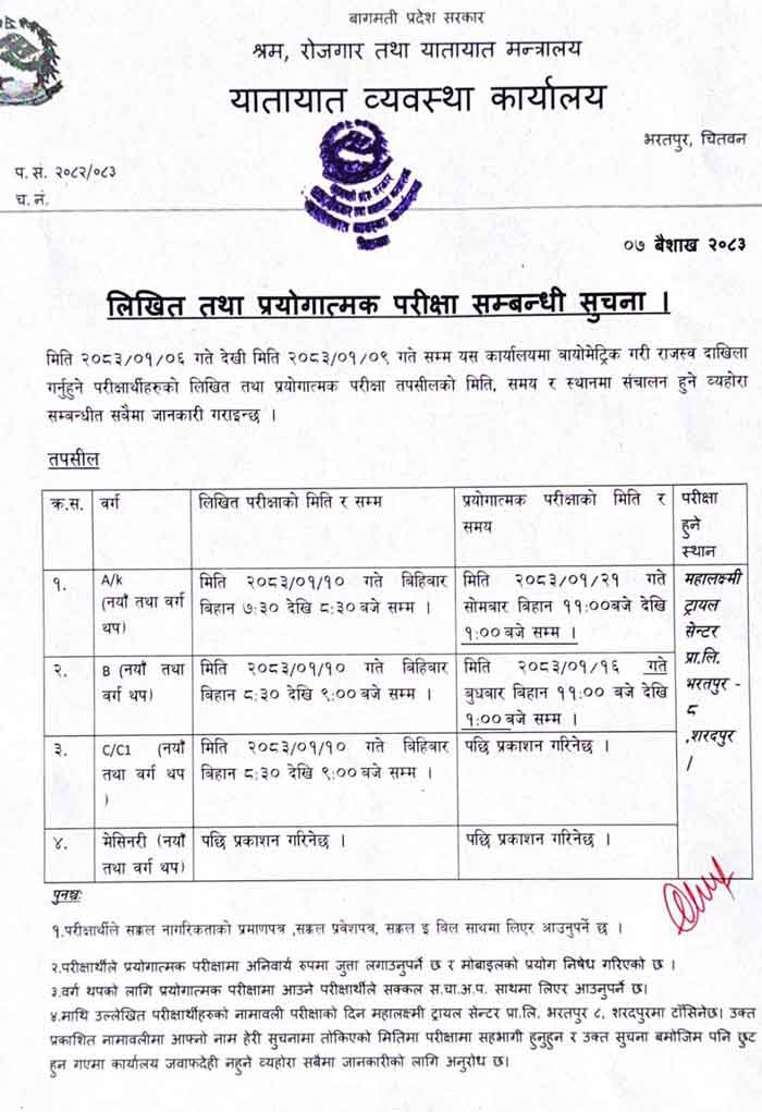 Province Government,Yatayat Byabastha Karyalaya ( Transport Management Service Office) published the written exam and trial exam date and routine for online driving license form fill up candidate. Driving license exam routine & trial exma date. Ministry of Physical Infrastructure Development, Transportation Management Service Office, Bagmati Pradesh Hetauda Written and Trial Exam Information.