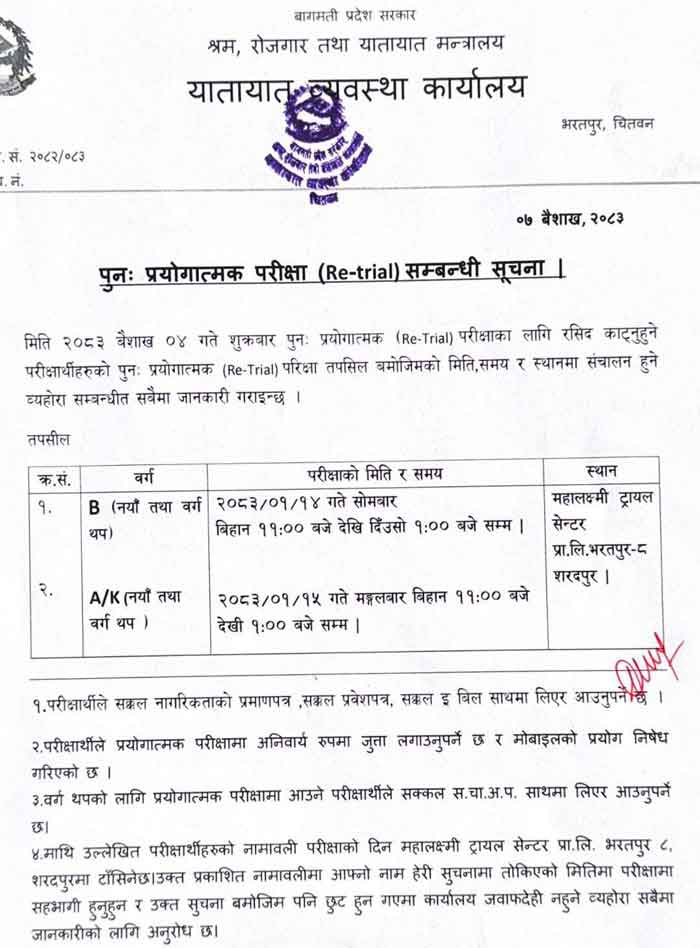 | A/K (Motorcycle/Scooter) | Baisakh 10, 2083 (Thursday) 7:30 AM – 8:30 AM | Baisakh 21, 2083 (Monday) 11:00 AM – 1:00 PM | Mahalaxmi Trial Center, Bharatpur-8 |