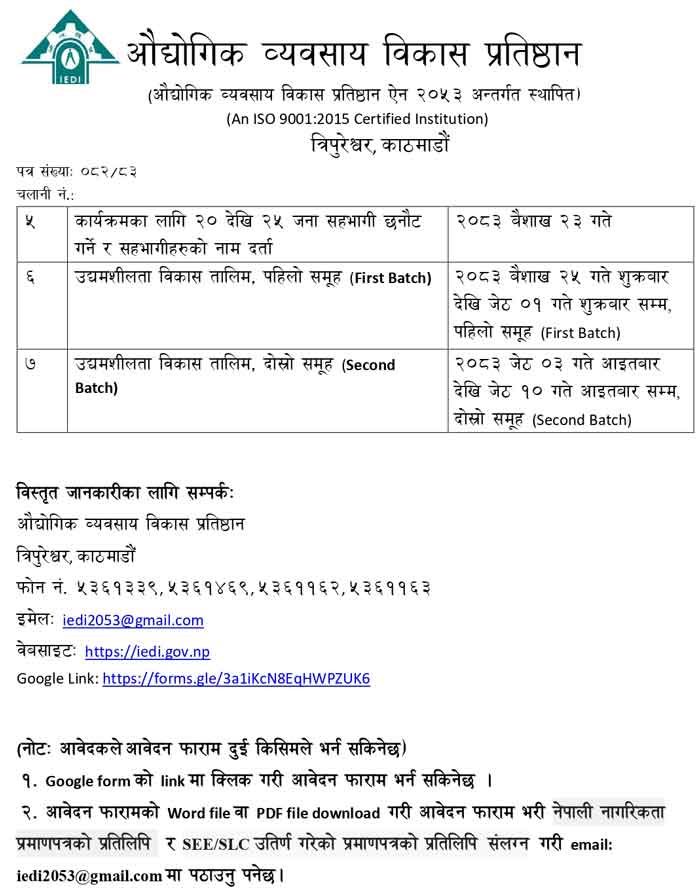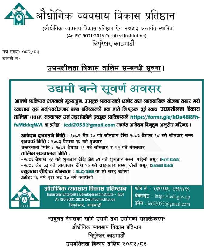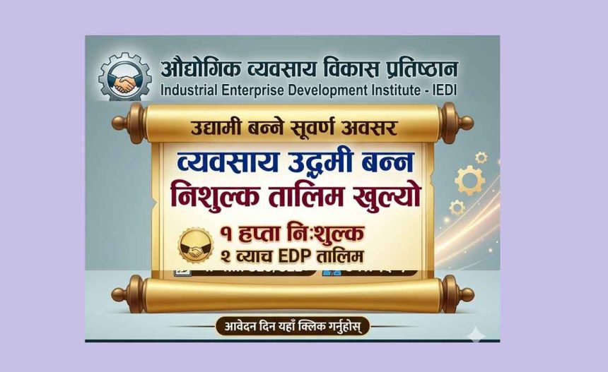 Are you dreaming of starting your own business but don’t know where to begin? Free Business Training Open. The Industrial Enterprise Development Institute (IEDI), an ISO 9001:2015 certified institution established under the Industrial Enterprise Development Institute Act 1996 (2053 BS), has announced a golden opportunity for aspiring entrepreneurs in Nepal.