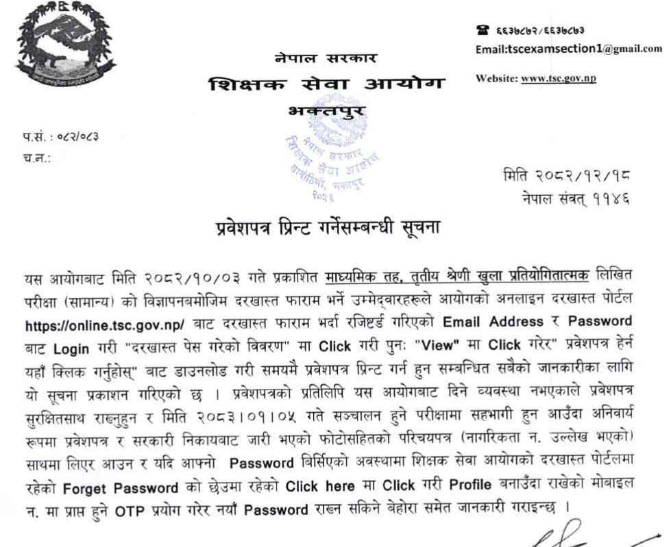 Shikshak Sewa Aayog Teacher Shikshak Vacancy Admit Card Print Notice. All the candidates are requested to Print Admit card by login in online.tsc.gov.np website portal.
