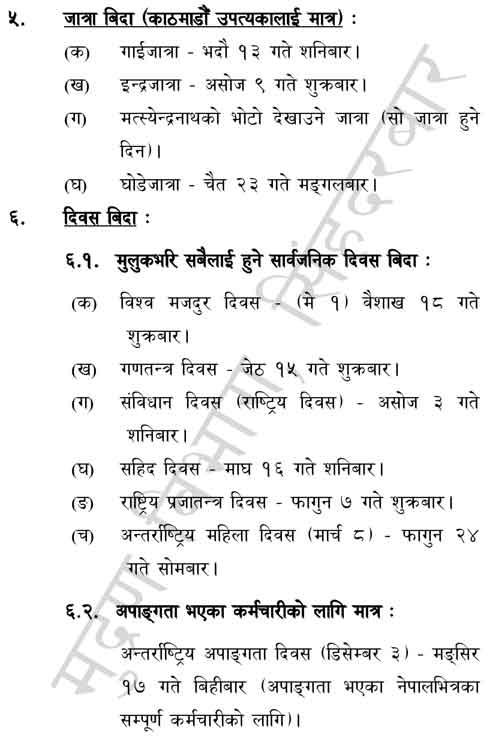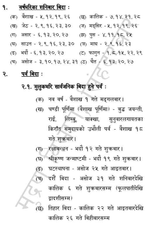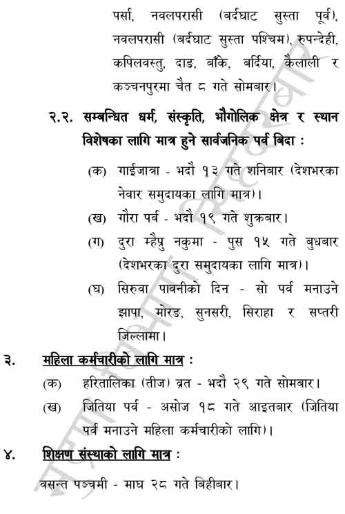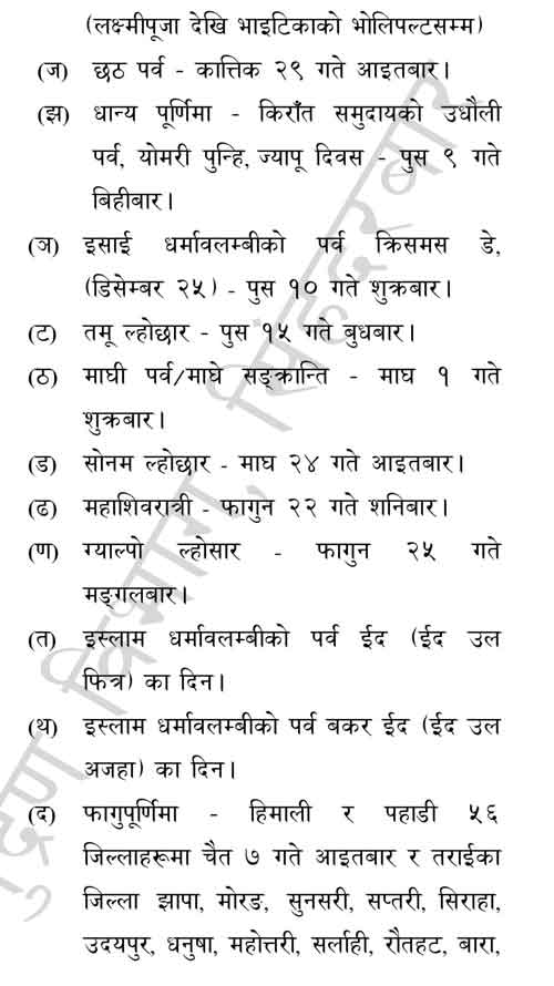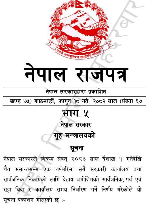 Nepal Gazette Information of the Ministry of Home Affairs, Government of Nepal This information has been published as the Government of Nepal has decided to fix the following public, festive and instead of leave and office hours for all government offices and public bodies in a year from 1st Baisakh, 2083 BS to Last Chaitra, 2083 BS. Public Holidays Details of Nepal for 2083 B.S (2026- 2027).