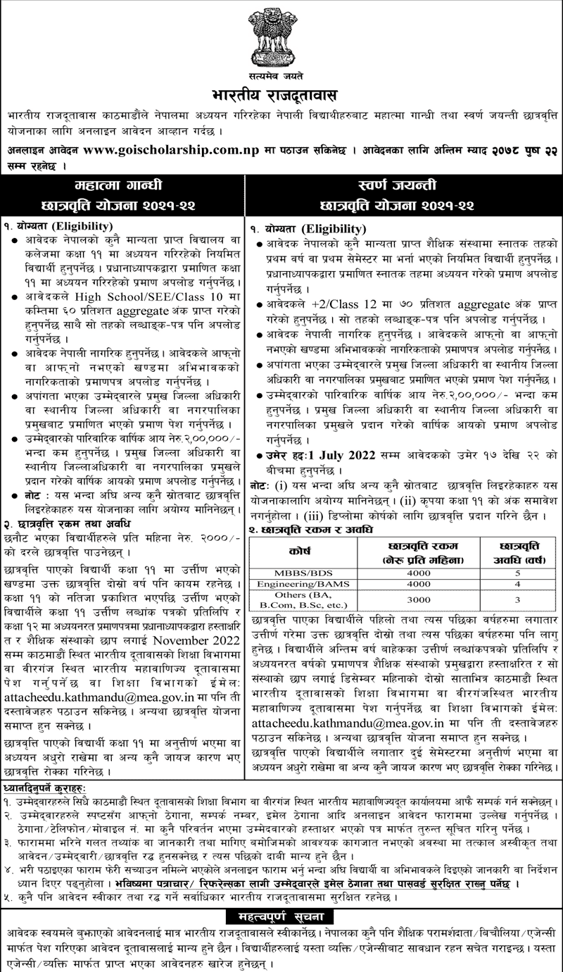 Mahatma Gandhi Scholarship Indian Government Scholarship Open For all. The Embassy of India, Kathmandu invites online applications for Mahatma Gandhi and Golden Jubilee Scholarship Schemes from Nepali nationals studying in Nepal. The Online Application may be submitted through web portal https://www.goischolarship.com.np/ The last date of submission of the application is 2078 Poush 22.
